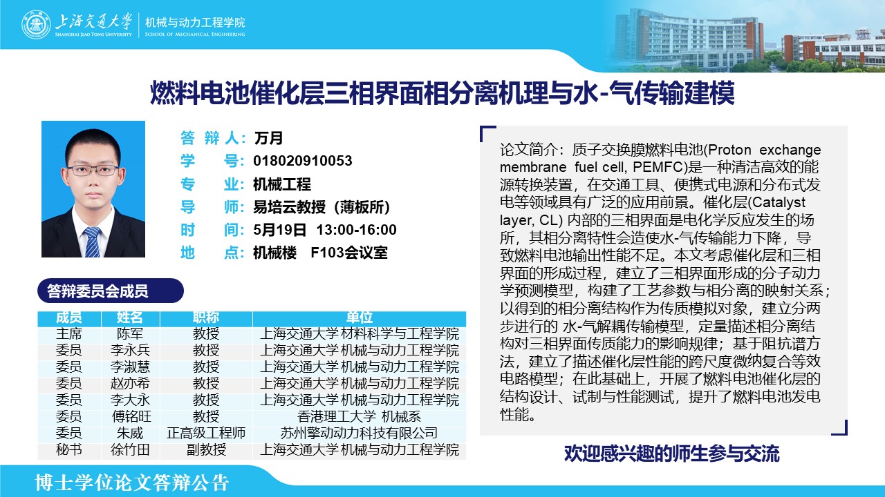 答辩人:万月| 导师:易培云 | 时间:5月19日 13:00 – 16:00 | 地点:机械楼 F103会议室
