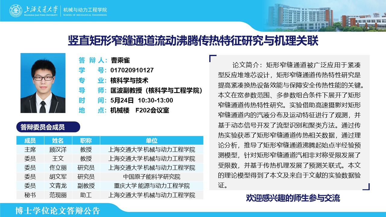 答辩人:曹乘雀| 导师:匡波 | 时间:5月24日 10:30 – 13:00 | 地点:机械楼 F202会议室