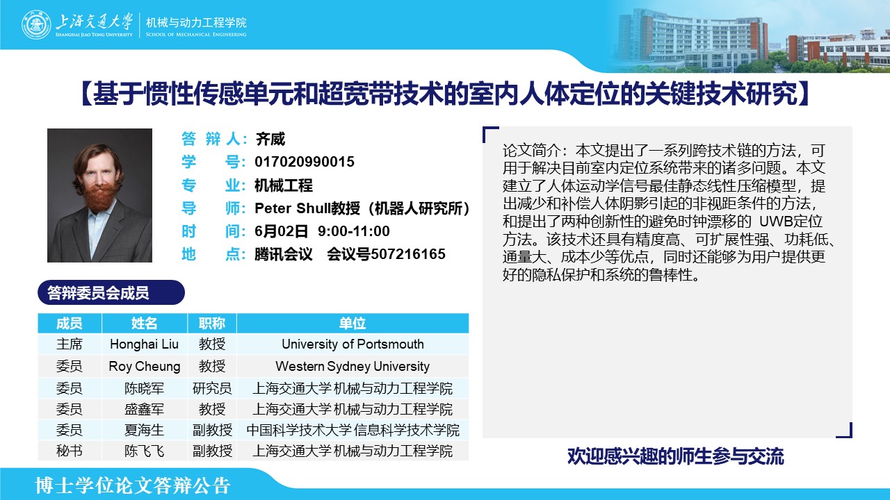 答辩人:齐威| 导师:Peter Shull | 时间:6月2日 9:00 – 11:00 | 腾讯会议会议号:507216165
