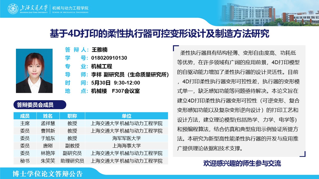 答辩人:王雅楠| 导师:李祥 | 时间:5月30日 9:30 – 12:00 | 地点:机械楼 F307会议室