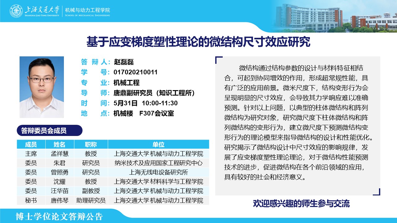 答辩人:赵磊磊| 导师:唐鼎 | 时间:5月31日 10:00 – 11:30 | 地点:机械楼 F307会议室