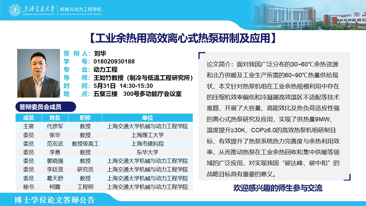 答辩人:刘华| 导师:王如竹 | 时间:5月31日 14:30 – 15:30 | 地点:五餐三楼 300号多功能厅会议室