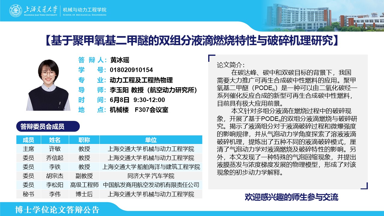 答辩人:黄冰瑶| 导师:李玉阳 | 时间:6月8日 9:30 – 12:00 | 地点:机械楼 F307会议室