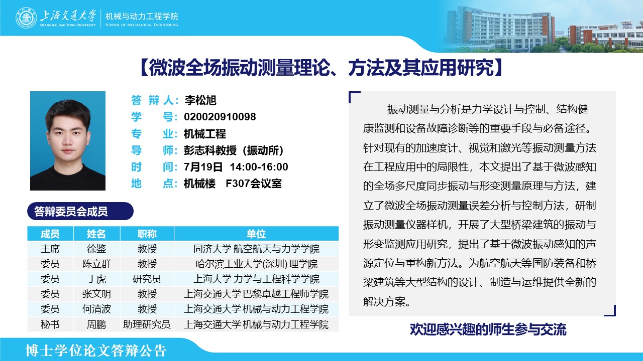 答辩人:李松旭| 导师:彭志科 | 时间:7月19日 14:00 – 16:00 | 地点:机械F楼 307会议室