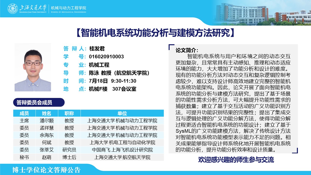 答辩人:桂发君| 导师:陈泳 | 时间:7月18日 9:30 – 11:30 | 地点:机械F楼 307会议室
