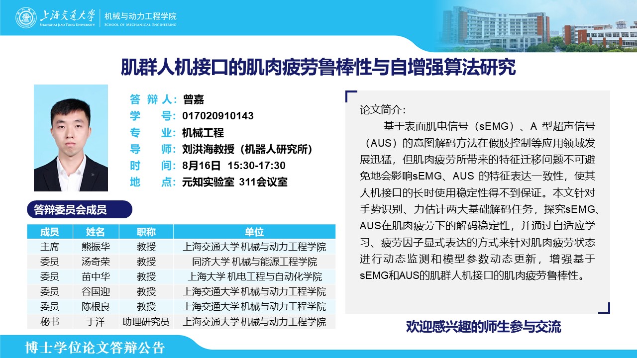 答辩人:曾嘉| 导师:刘洪海 | 时间:8月16日 15:30 – 17:30 | 地点:元知实验室 311会议室