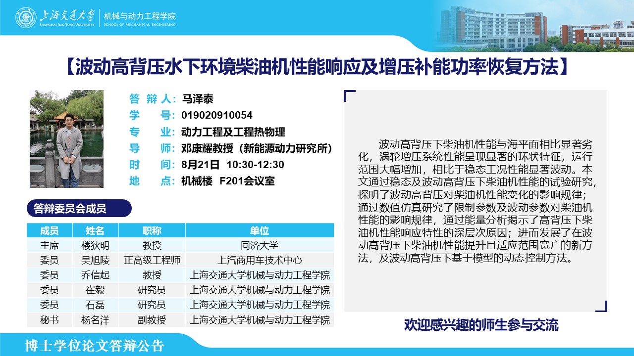 答辩人:马泽泰| 导师:邓康耀 | 时间:8月21日 10:30 – 12:30 | 地点:机械楼 F201会议室