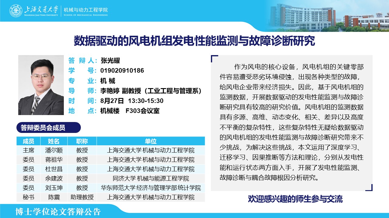 答辩人:张光耀| 导师:李艳婷 | 时间:8月27日 13:30 – 15:30 | 地点:机械楼 F303会议室