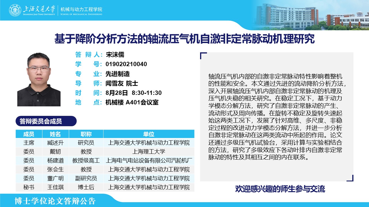 答辩人:宋沫儒| 导师:闻雪友 | 时间:8月28日 8:30 – 11:30 | 地点:机械楼 A401会议室