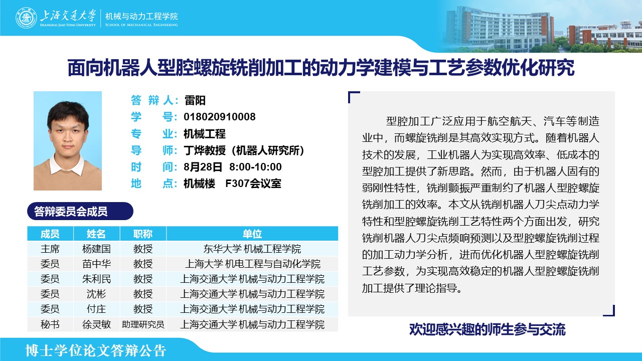 答辩人:雷阳| 导师:丁烨 | 时间:8月28日 8:00 – 10:00 | 地点:机械楼 F307会议室