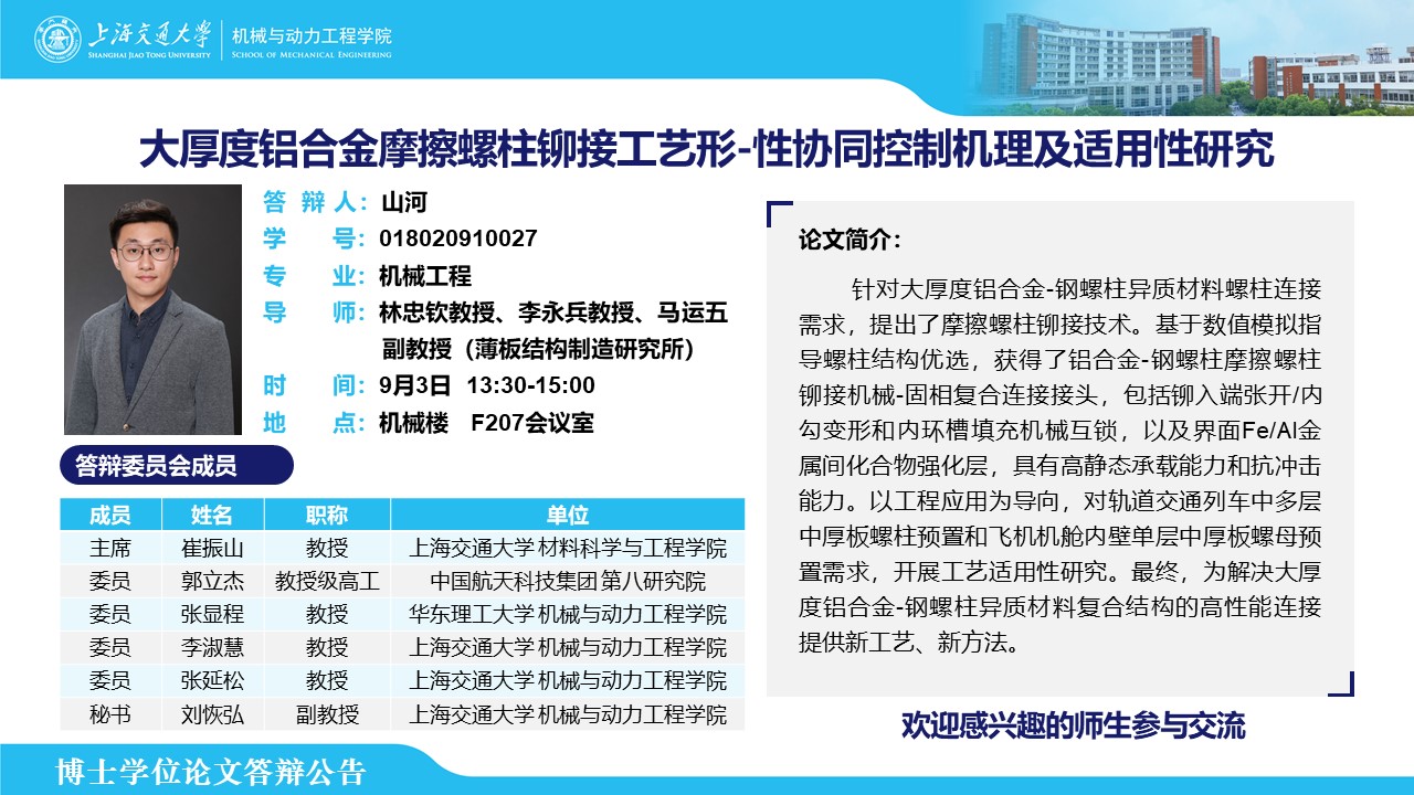 答辩人:山河| 导师:林忠钦、李永兵、 马运五 | 时间:9月3日 13:30 – 15:00 | 地点:机械楼 F207会议室