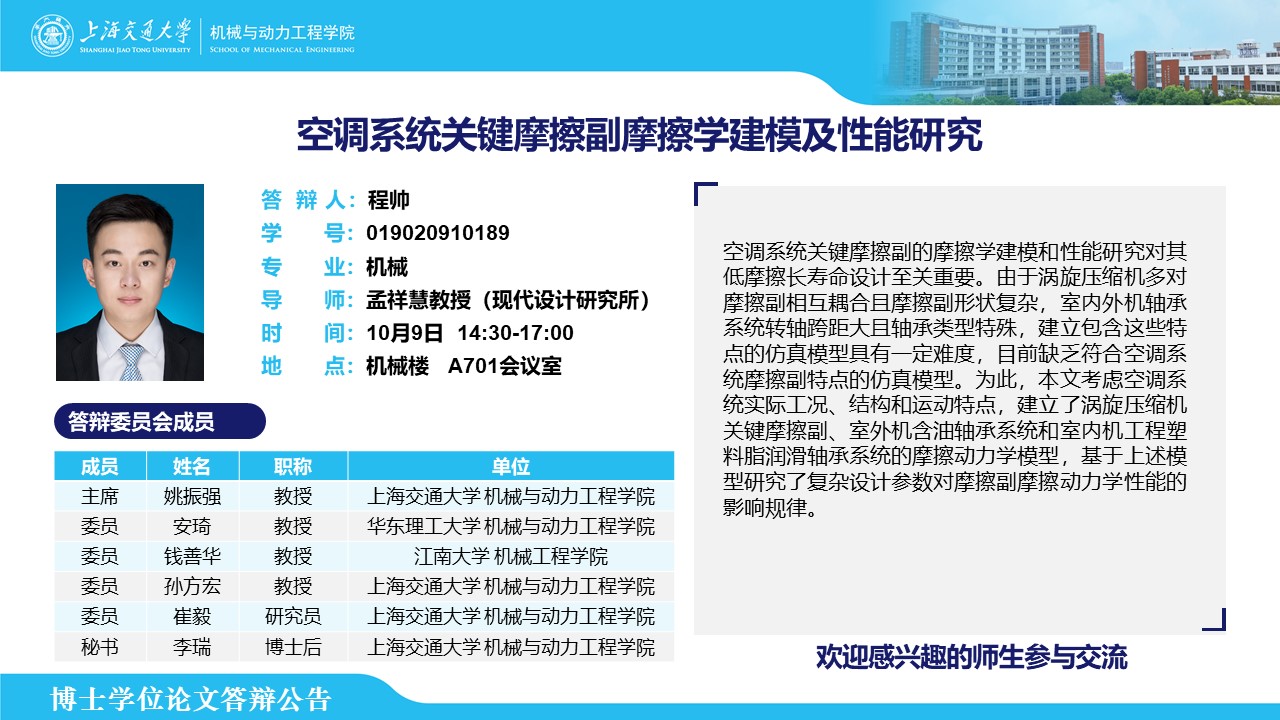 答辩人:程帅| 导师:孟祥慧 | 时间:10月9日 14:30 – 17:00 | 地点:机械楼 A701会议室