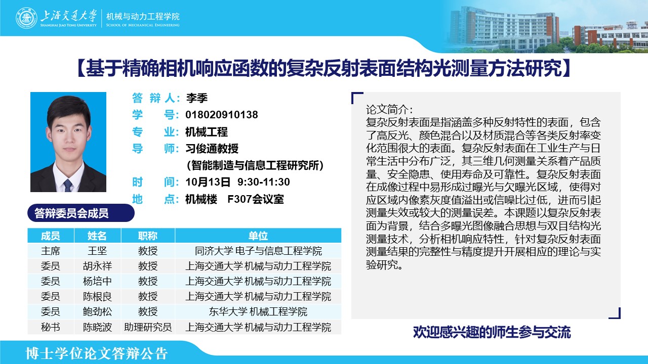 答辩人:李季| 导师:习俊通 | 时间:10月13日 9:30 – 11:30 | 地点:机械楼 F307会议室