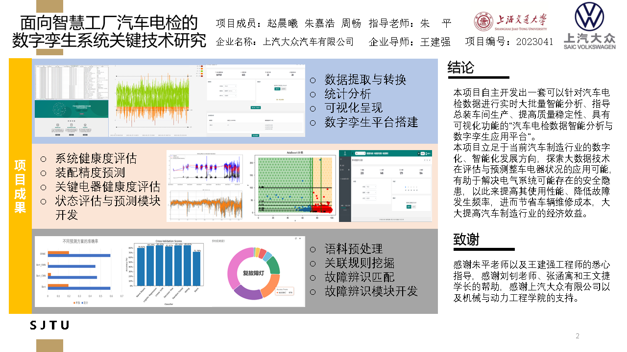 本项目名称为《面向智慧工厂汽车电检的数字孪生系统关键技术研究》,合作企业为上汽大众汽车有限公司。当前车型电气网络复杂程度日益增加,汽车生产车间每日都会产生大量涉及的高价值电检数据。本项目自主开发出一套可指导总装车间生产、提高质量稳定性、实现实时可视化的“汽车电检数据智能分析与数字孪生应用平台”,立足于当前汽车制造行业的数字化、智能化发展方向,有助于节省车辆返修成本,大大提高汽车制造行业的经济效益。