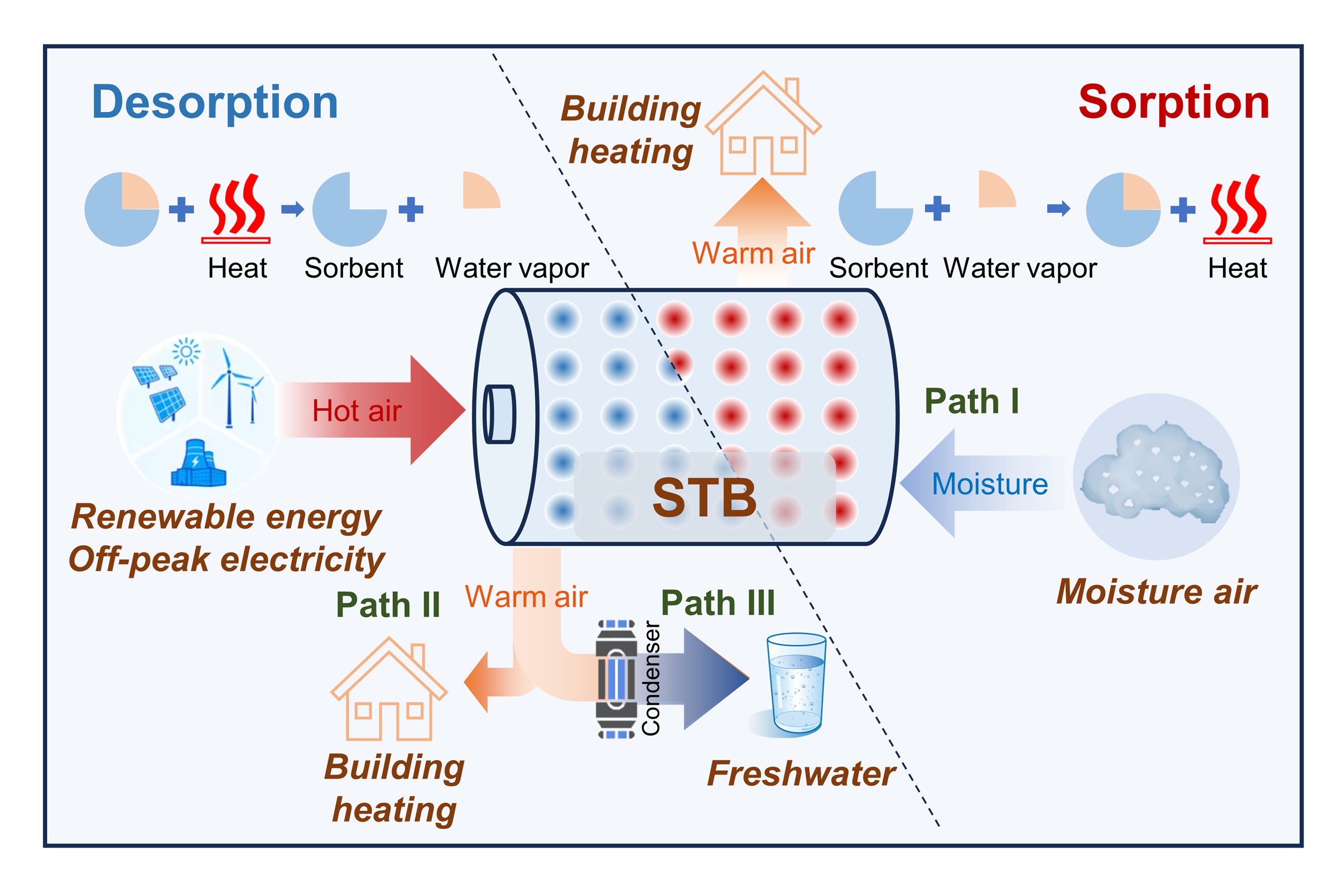 研究展示了通过水蒸气的吸附和解吸,同时实现热能存储和水资源获取的可能性。未来的研究方向可以专注于系统组件的设计优化,旨在实现更灵活、稳定的热能输出温度控制和更大规模淡水生产,为该技术不同领域的实际应用创造条件。