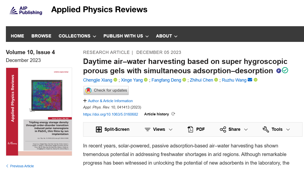 近日,上海交通大学王如竹教授领衔的“能源-水-空气”交叉学科创新团队ITEWA在物理领域国际期刊Applied Physics Reviews上发表了题为“Daytime air–water harvesting based on super hygroscopic porous gels with simultaneous adsorption–desorption”的研究论文。团队通过非离子型表面活性剂羟丙甲基纤维素与氯化锂经物理发泡形成多孔吸湿凝胶,提出了空气取水领域的“8020原则”,在“解吸腔”和“冷凝腔”并联式装配的原理样机上验证了实际取水性能,为日间低成本连续式空气取水提供了一种新的可行路径。制冷与低温工程研究所博士后香承杰和博士研究生杨辛格为论文第一作者,王如竹教授为通讯作者。