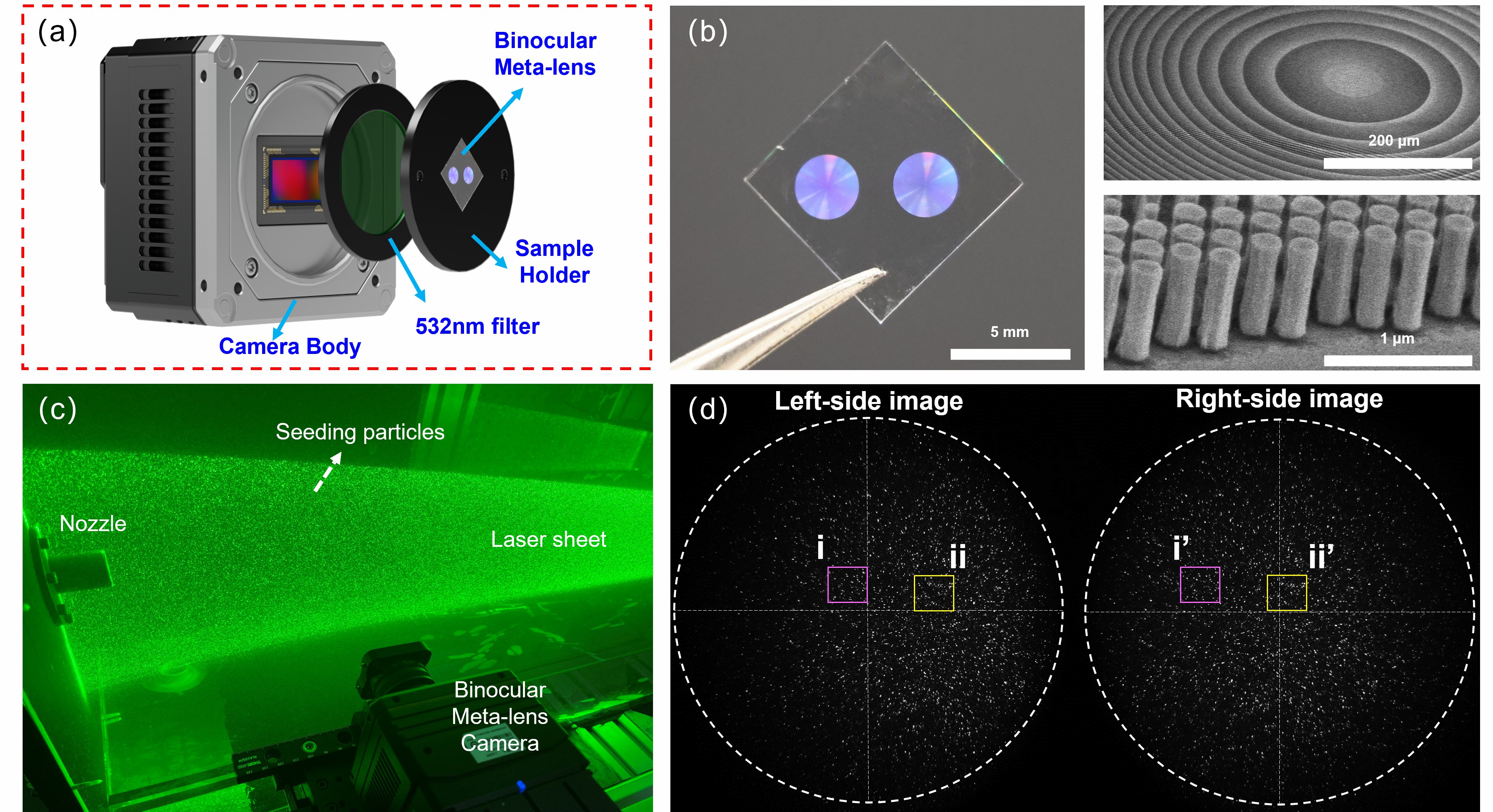 (a) 双目超构透镜相机 (b) 双目超构透镜 (c) 实验系统 (d) 粒子图像