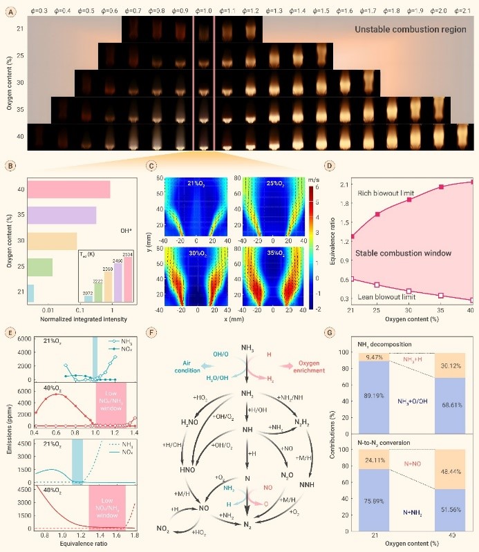 氨是全球产量最高的化工原料之一,被广泛运用于农业、工业、医药等领域。近年来,氨已成为一种极具前景的零碳燃料和储氢载体,在能源领域引发了广泛关注,对于燃气轮机、内燃机、锅炉等燃烧装备脱碳意义重大。针对氨燃烧污染排放高和反应活性低两大挑战,研究者发现了氨富燃条件下剩余燃料对NOx的热还原机制,观察到了低NOx/NH3排放当量比窗口,并在燃料侧提出了活性燃料掺烧、预裂解等多种燃烧强化策略。然而前人工作中氨燃烧低排放窗口极为狭窄(0.01-0.06),且在燃料侧强化策略影响下易出现污染排放“此消彼长”的严峻挑战,氨燃烧活性和污染排放同步调控已成为国际氨能领域的“圣杯”问题之一。