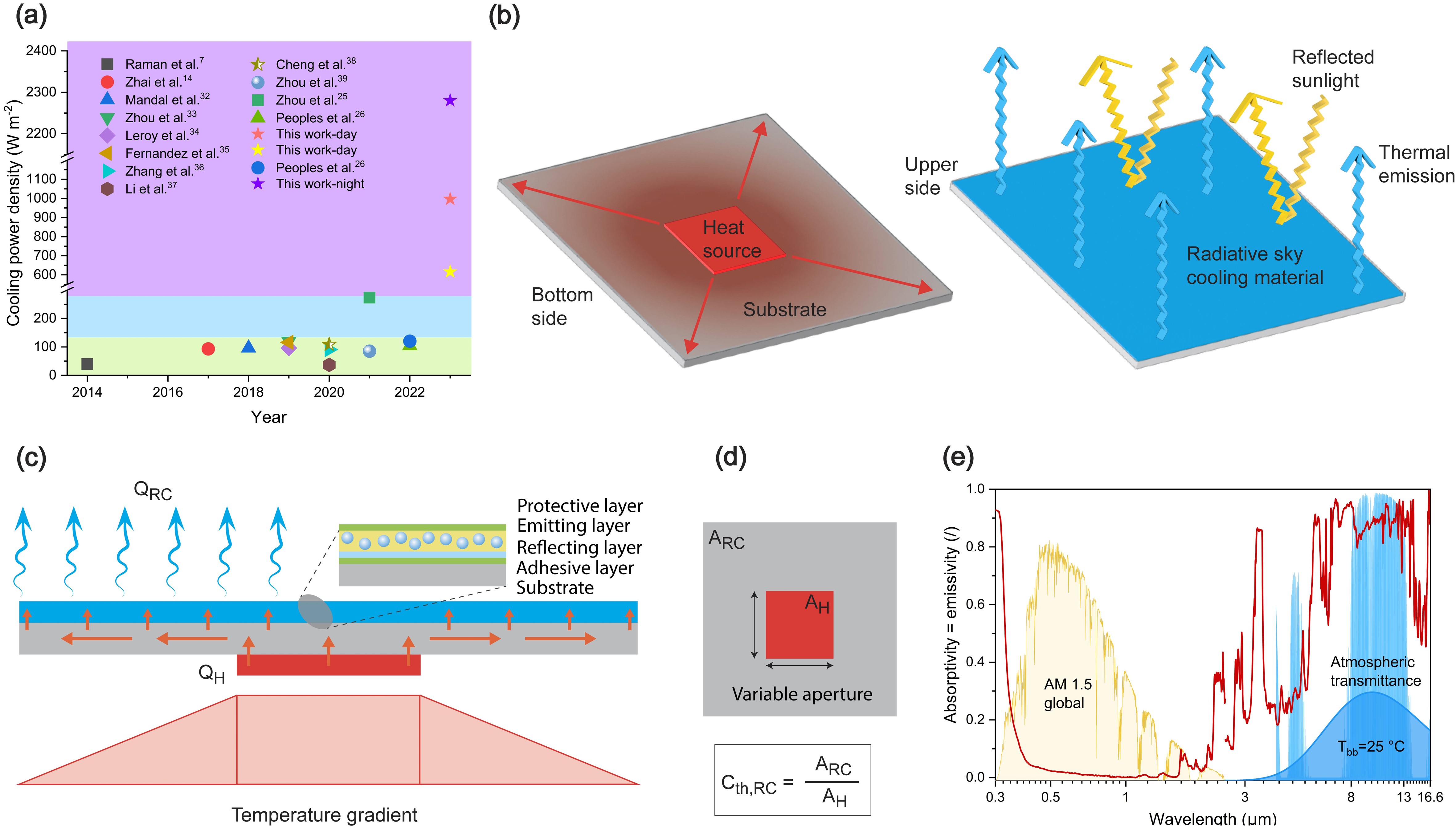 全球变暖和人类对制冷需求的持续增加使得人们更加关注可持续制冷,尤其是利用宇宙环境本身实现制冷。与传统主动制冷系统消耗能源不同,被动天空辐射制冷通过对特定波长透明的大气窗口将地球辐射表面的红外热释放到外层空间,实现了无需任何电力输入的制冷。然而,这些辐射材料的冷却功率密度比地球接受太阳辐射的功率低一个数量级,约为~100 W/m²水平。仅通过改善其光谱性能已经很难达到更高的冷却功率密度,迫切需要进一步的研究实现制冷功率密度的成倍显著提升。