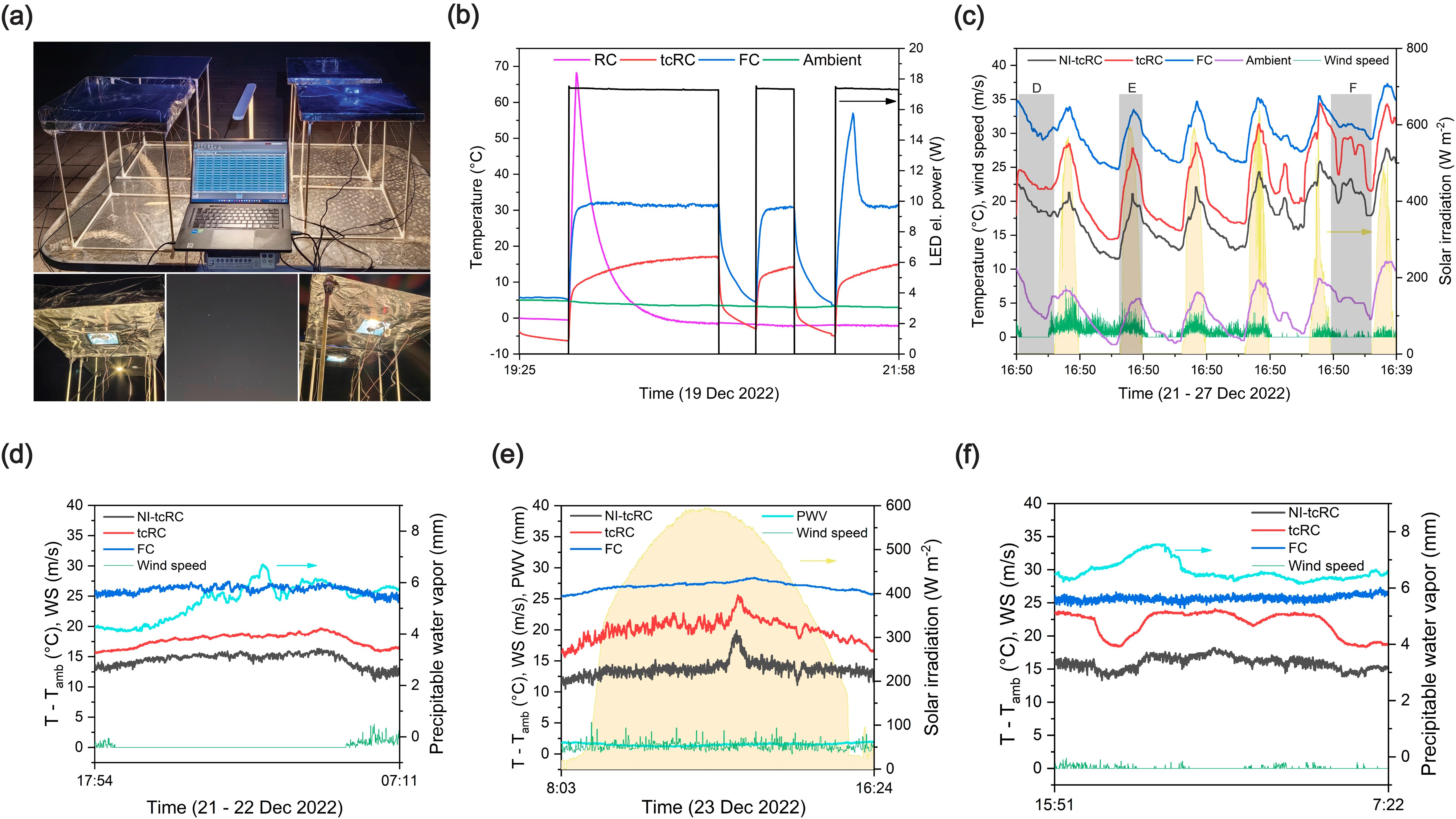 作者进一步研究了该概念在低于环境温度和超过环境温度下的散热性能。对有无辐射制冷材料进行了对比研究发现,有辐射制冷材料的高导热基板的散热功率与温度下降显著优于仅保留金属基板的性能,两者表面温度差可高达25°C(低于环境温度下),而在超过环境温度进行散热时,温度差可高达22°C。同时,作者还对气候和地理特征的影响进行了广泛探究。八月至十二月期间,在斯洛文尼亚卢布尔雅那、中国上海和昆明三个地点进行了66个实验,验证了该概念在宽环境温度和相对湿度条件下良好的辐射冷却性能。此外,为了展示tcRC的实用性,研究还对LED灯的冷却进行了为期一周的概念验证实验,使用了具有高热流密度约为8000 W m-2的LED照明灯,与采用散热器和风扇组合的主动冷却方式相比,tcRC这种纯被动冷却方式能使LED灯的温度在夜间降低10°C以上,比主动散热策略更有优势。同时对LED灯进行三个连续的ON-OFF循环,从LED灯的温度响应表明,所提出的tcRC概念非常适用于电子器件间歇式运行发热冷却场景。