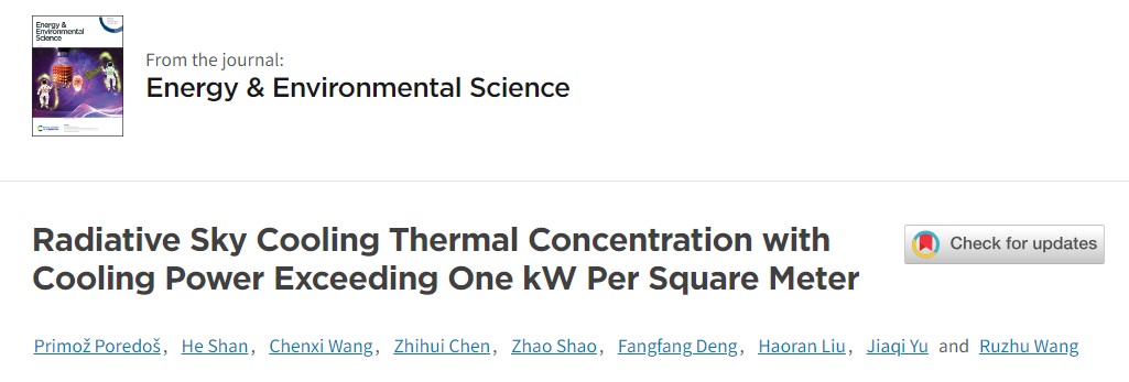 近日,80足球直播吧王如竹教授领衔的ITEWA多学科交叉创新团队在Energy & Environmental Science上发表了题为Radiative Sky Cooling Thermal Concentration with Cooling Power Exceeding One kW Per Square Meter的论文,提出辐射制冷热集中策略,实现制冷功率超过千瓦每平米。论文第一作者是制冷与低温工程研究所博士后Primož Poredoš,通讯作者是王如竹教授。
