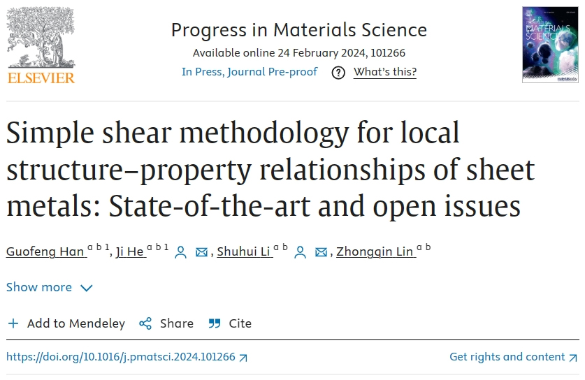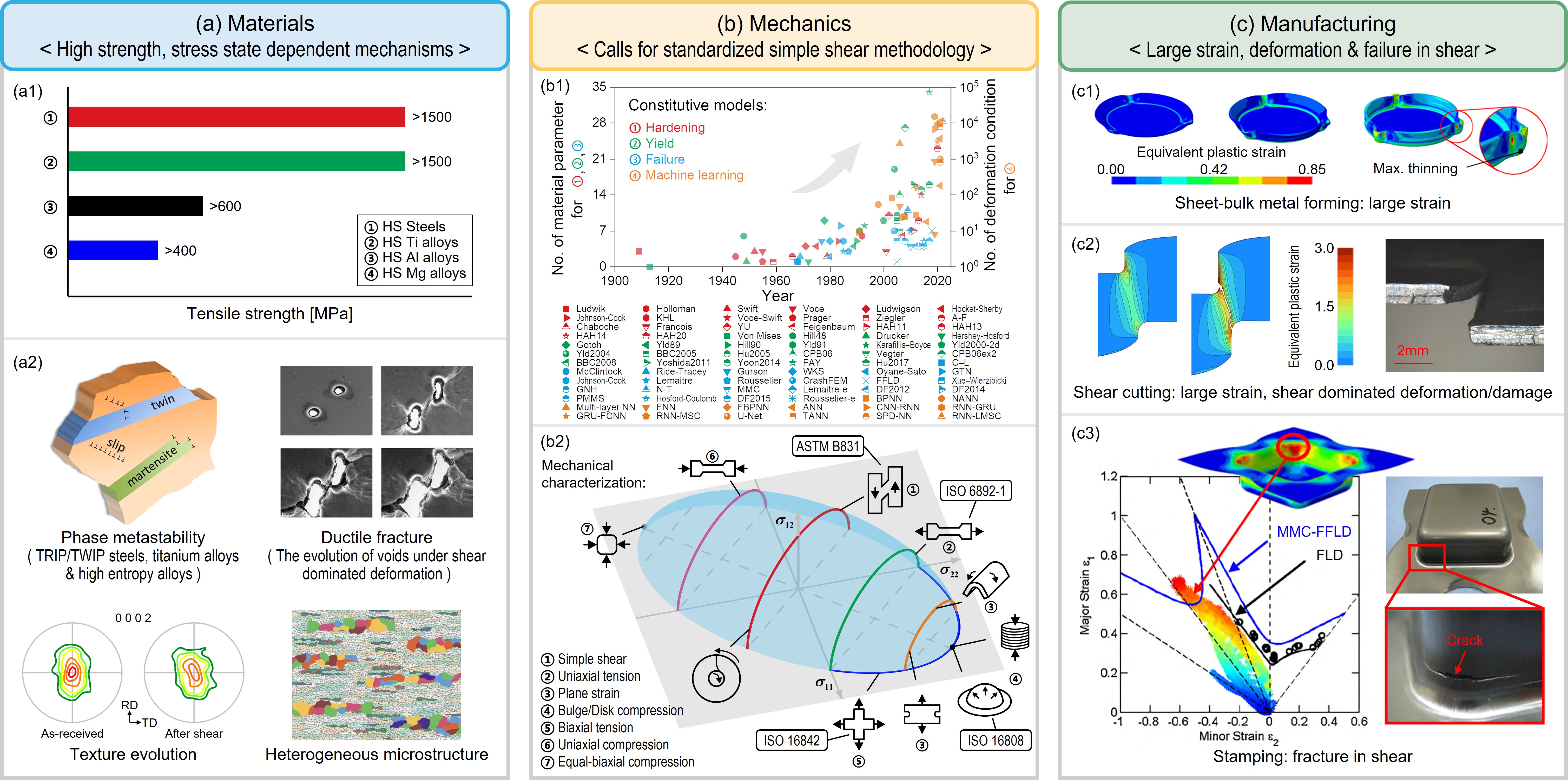 近日,上海交通大学薄板结构制造研究所林忠钦院士课题组在国际材料领域期刊Progress in Materials Science上发表了题为“Simple shear methodology for local structure–property relationships of sheet metals: State-of-the-art and open issues”的综述论文。论文总结了金属薄板简单剪切测试方法的理论基础、实验技术以及其在揭示材料结构-性能关系中的应用现状,进一步指出了目前存在问题和潜在解决方案。薄板结构制造研究所何霁副教授和李淑慧教授为论文共同通讯作者,博士生韩国丰和何霁副教授为论文共同第一作者。