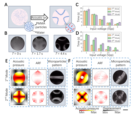团队利用超声波技术控制细胞-水凝胶悬浮液中的细胞排列,采用毛细管作为超声细胞图案化和水凝胶成形的容器,并在毛细管外部附着压电换能器,换能器产生的超声波引起毛细管共振,同时通过调节超声波的频率和强度,控制毛细管内部的声压分布。细胞-水凝胶悬浮液中的细胞受到声波的作用被驱动到压力节点处,形成相对应的图案。在对细胞辐射状图案的可行性进行分析和验证的基础上,团队将超声驱动细胞图案化技术与微流控生物打印技术相结合,制备了具有图案化细胞结构的微纤维或微管。
