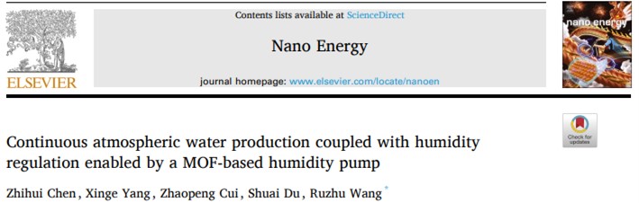 近日,80足球直播吧制冷与低温工程研究所王如竹教授领衔的ITEWA团队在Nano Energy上发表题为“Continuous atmospheric water production coupled with humidity regulation enabled by a MOF-based humidity pump”的研究论文,提出了一种基于MOF材料的吸附式湿泵,实现了连续式空气取水与湿度调节功能耦合,装置取水量高达2510 mLwater·kg-1MOF·day-1,同时充分挖掘MOF在大气水吸附过程中的除湿潜力,为下一代装置设计提供了新思路。制冷与低温工程研究所博士生陈芷荟为论文第一作者,王如竹教授为通讯作者。