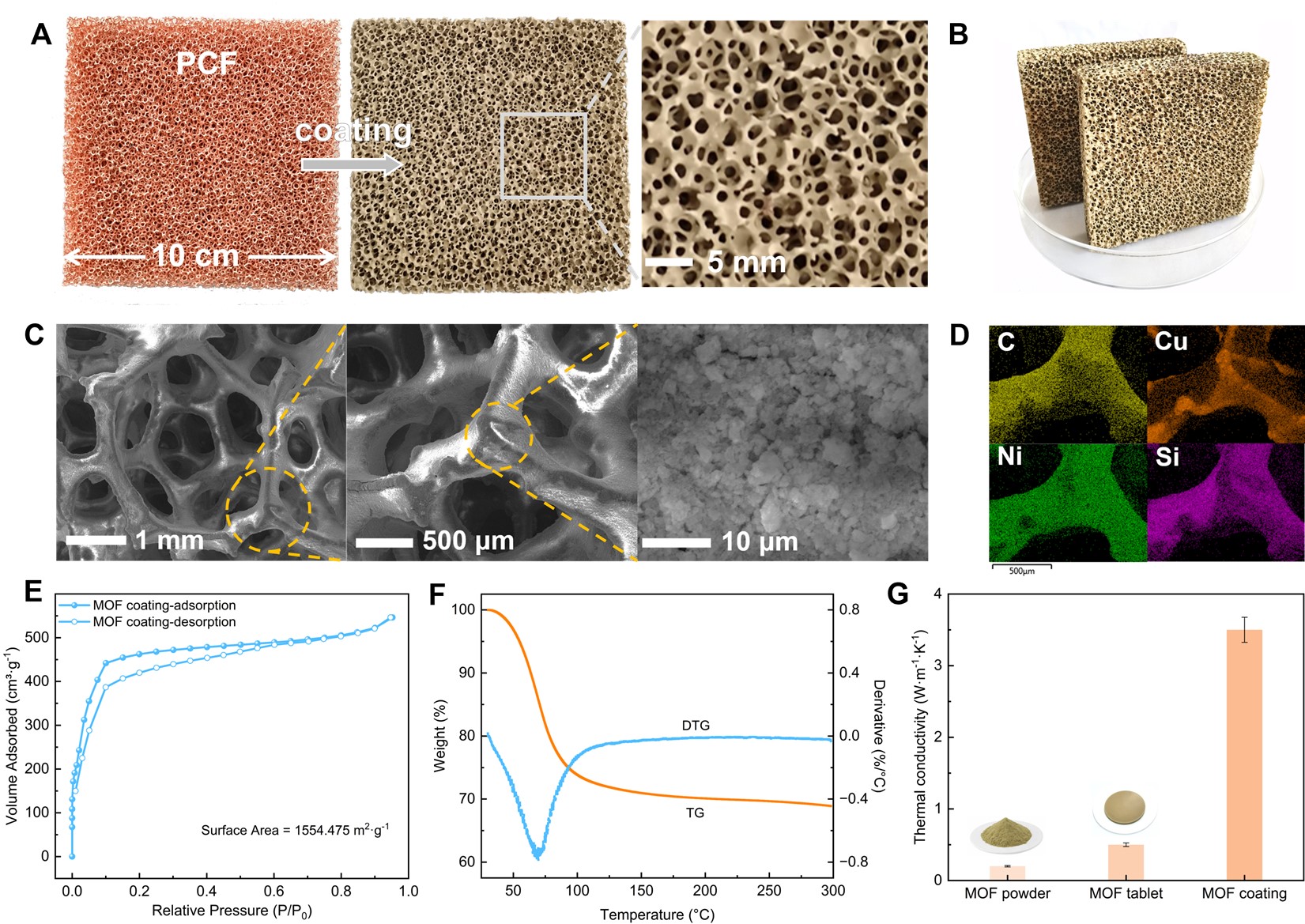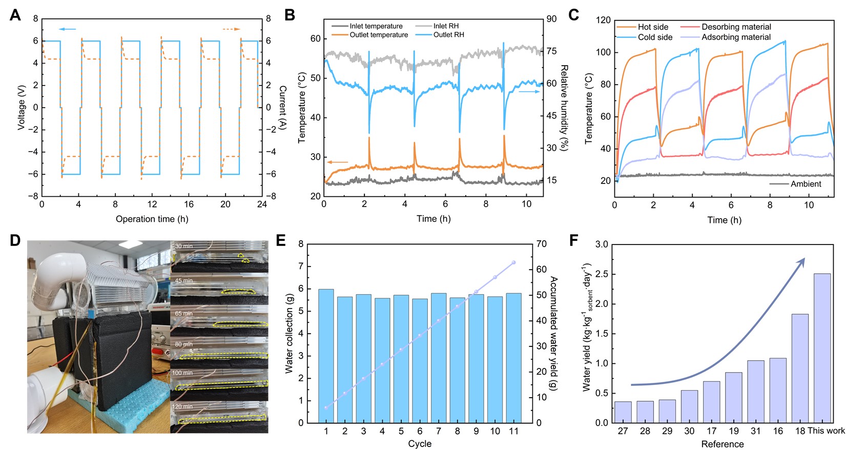 研究团队选用金属有机框架材料Ni2Cl2(BTDD)作为大气水吸附剂,采用原位浸渍法制备得到具有快速水蒸气吸附-解吸动力学特性的MOF涂层吸附模块,设计搭建了一款小型吸附式热电湿泵,采用多循环吸附-解吸同步运行策略以实现连续式空气取水耦合区域湿度调节目标。实验结果显示,装置吸附侧出口空气湿度由72% RH降到58% RH,连续运行11个循环取得2510 mLwater·kg-1MOF·day-1的日产水量,优于现有的大多数主动式空气取水装置,与吸附剂本身的吸湿能力相比,多循环连续运行策略使其吸附性能提升了约3.7倍。