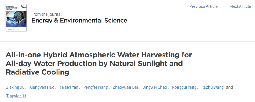 近日,80足球直播吧ITEWA创新团队在能源领域期刊Energy & Environmental Science上发表题为“All-in-one Hybrid Atmospheric Water Harvesting for All-day Water Production by Natural Sunlight and Radiative Cooling”的研究性论文,提出了基于自然阳光和辐射致冷耦合驱动的全天24小时空气产水策略,构建了基于辐射致冷和空气冷却的梯级冷凝空气取水装置,实现了低能耗下的高产水量,为解决淡水资源短缺问题提供了新的技术途径。制冷与低温工程研究所助理教授许嘉兴为论文第一作者,李廷贤研究员为通讯作者,王如竹教授与华中科技大学杨荣贵教授为共同通讯作者。