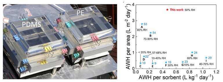 为了满足干旱地区的用水需求,开发新的水源极为重要。大气中蕴藏着丰富的水蒸气,其含量约为全球每年消耗水量的3.4倍,基于水蒸气吸附的大气水收集技术(S-AWH)近年来受到广泛关注,利用吸附材料和空气取水设备可以从空气中攫取水分,实现随时随地饮用水生产。然而,吸附式空气取水技术面临着高能耗和低产水量的瓶颈。为此,论文提出了一种耦合利用太阳能光热和全天辐射致冷实现全天高效空气取水新策略。为了构建紧凑高效的空气取水装置,论文采用透射型辐射冷却膜(TRC)允许太阳光透过辐射致冷膜,实现了同一占地面积下的顶部日间辐射致冷与底部光热转化集热。白天运行时,阳光透过TRC膜加热吸附材料驱动水蒸气释放,释放的水蒸气在TRC膜表面快速凝结集水。夜晚运行时,吸附材料从空气中捕获水蒸气,同时周围空气中高湿度的水蒸气在TRC膜上凝结,实现夜间辐射致冷驱动的直接产生水。
