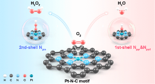 本工作中,作者制备了两种碳纳米管负载的Pt-N-C单原子催化剂用于ORR,在0.3 VRHE 电位下,实现了H2O2产物选择性从10%至85%的调节。结合电催化周转频率TOF测定,以及软/硬线X射线吸收谱XAFS、核壳分离纳米粒子增强拉曼光谱SHINERS、DFT理论计算分析,证明了Pt-N-C结构中第一壳层的吡啶-N和吡咯-N配位有利于O2转化为H2O,而引入第二层石墨-N掺杂可以微调Pt中心位点的电子结构,导致*OOH的结合强度减弱,从而主导了O2转化为H2O2过程。该工作揭示了单原子位点附近微观结构和性能间的构效关系,为高选择性和高稳定性单原子类催化剂设计提供了研究基础。