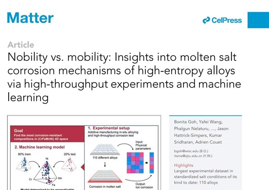 近日,80足球直播吧核科学与工程学院王亚飞副教授在Cell子刊Matter上发表了“Nobility vs. mobility: Insights into molten salt corrosion mechanisms of high-entropy alloys via high-throughput experiments and machine learning”研究论文,提出了通过人工智能机器学习来增强对熔盐腐蚀现象的理解和认知。王亚飞副教授为该论文的共同一作和通讯作者。