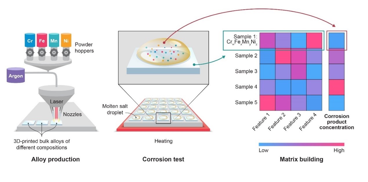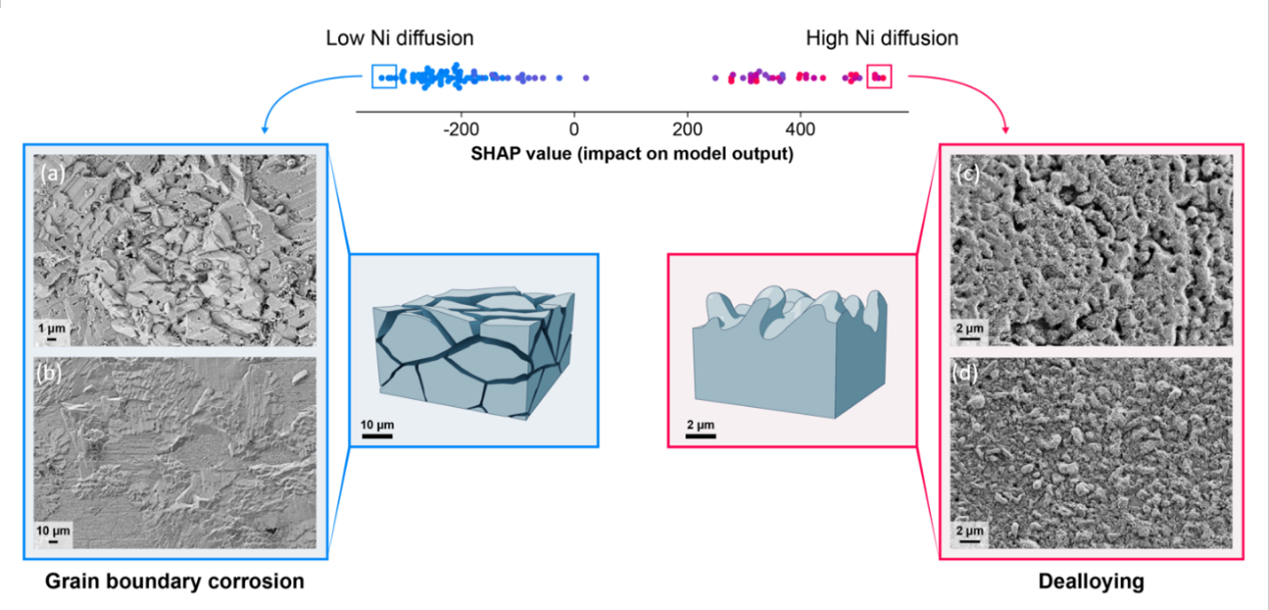 高温熔盐传热性能好、系统压力小、使用温度高、价格低、安全可靠,是性能优良的高温传热蓄热介质,在第四代核反应堆冷却剂及核燃料、反应堆乏燃料干法后处理以及太阳能储能和传热上具有广阔的应用前景和市场空间。然而,材料的腐蚀是制约这些前景应用的棘手问题。由于高温熔盐腐蚀实验数据的缺乏,熔盐中材料的腐蚀一直被简单认为是一个热力学控制的过程。王亚飞副教授通过发展一系列高通量合金材料设计、合成与腐蚀测试方法,实现了100余种不同合金材料熔盐腐蚀实验数据的积累。他基于大批量实验数据,通过耦合材料腐蚀影响因素,利用人工智能机器学习方法对实验数据的分析揭示了CrFeMnNi合金系列在熔盐中的腐蚀机制。研究发现CrFeMnNi合金系列的腐蚀受Ni在合金中扩散的控制,而非传统认知中合金的热力学稳定性。该研究是人工智能机器学习在分析科学现象背后机理上的新应用,对合金的设计也具有重要的指导作用。