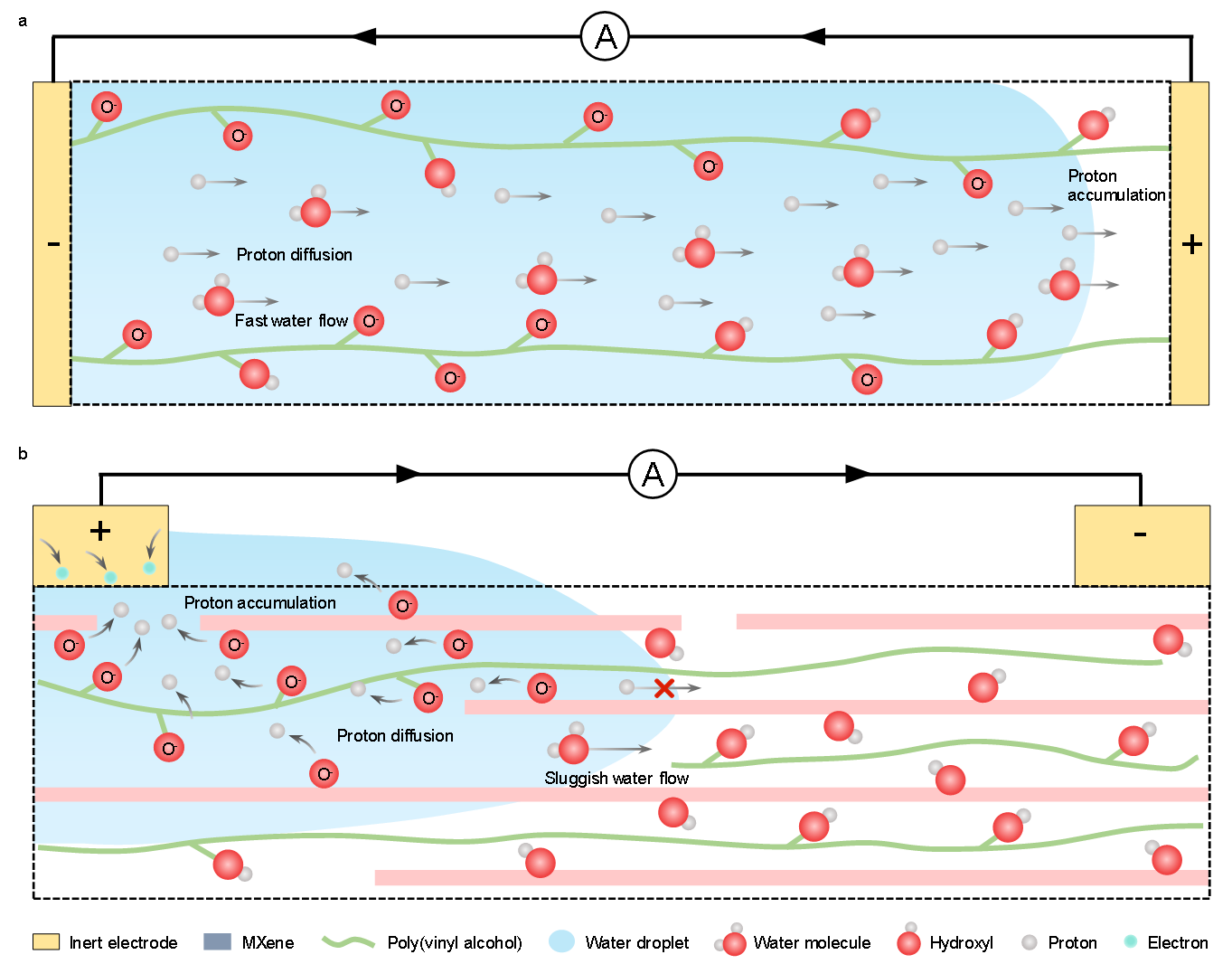 从环境中收集能源是满足分散能源需求的有效方法。借助材料与水分子之间的相互作用,水伏发电技术可以从无处不在的自然水循环过程获取电能,得到学界内广泛关注。研究表明仅通过水滴滴在纳米材料上、或将纳米材料的一侧浸入水溶液中,即可诱导水流流过带电表面,进而持续供电。其中,水溶液中与材料带电表面极性相反的离子随水流一起运动被认为是必不可少的。Nature Nanotechnology最新研究成果表明,解离的质子在MPCF复合薄膜中会沿与水流渗透方向相反的方向扩散,并能产生持久的电能,即“质子逆水流扩散诱导发电”,打破了解离离子必须随水流协同运动发电的传统认知。