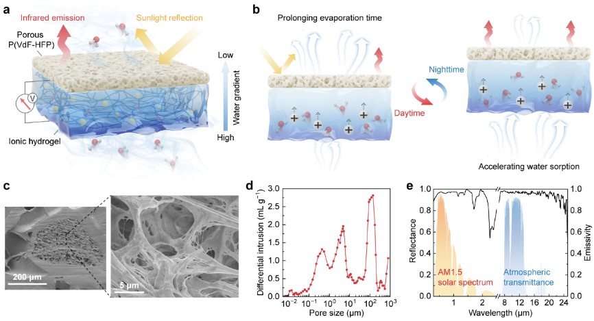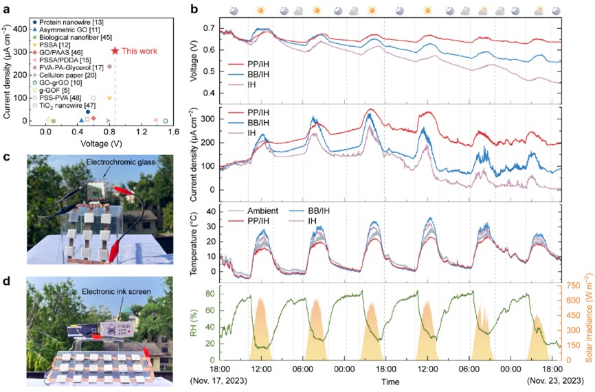 研究团队提出了通过辐射致冷调控太阳辐射和环境温度,辅助实现高效稳定湿气发电的新策略。研究人员设计了一种由疏水多孔聚偏氟乙烯-六氟丙烯 [P(VdF-HFP)] 顶层和亲水离子水凝胶底层组成的湿度发电器件。由聚乙烯醇(PVA)和植酸(PA)建立的离子水凝胶网络,与削弱氢键相互作用的LiCl结合,赋予PP/IH优异的吸湿能力、丰富的解离电荷载体和高效的水/离子传输性能。水凝胶可自发吸收空气中的水分并解离出离子,顶层疏水多孔结构可自发驱动水分解吸,基于此构建的吸附-解吸动态平衡驱动水/离子连续流过带负电荷的纳米通道,产生持续电力输出。与此同时,分级多孔顶层的辐射冷却效应在日间降低蒸发温度,保证连续定向水/离子流动,在夜间有效平衡吸附放热,提高吸附速率,促进水分梯度恢复,实现昼夜交替中稳定的吸附-解吸循环。