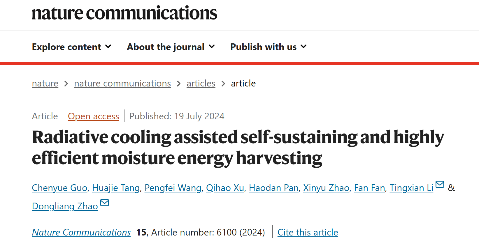 近日,80足球直播吧制冷与低温工程研究所ITEWA团队与东南大学团队合作在国际期刊Nature Communications发表了题为 “Radiative cooling assisted self-sustaining and highly efficient moisture energy harvesting” 的研究论文。该工作针对自然环境波动严重影响湿气发电稳定输出的难题,提出了一种辐射致冷辅助的高效稳定湿气发电新策略,构建了兼具“水分吸附-湿气发电-辐射致冷”多功能的双层聚合物凝胶,为实现波动自然环境中高效长时湿气发电提供了新思路。我院博士生王鹏飞和东南大学研究生郭晨玥、汤华杰为论文共同第一作者,李廷贤研究员和东南大学赵东亮教授为共同通讯作者,王如竹教授对该工作给予了指导和建议。