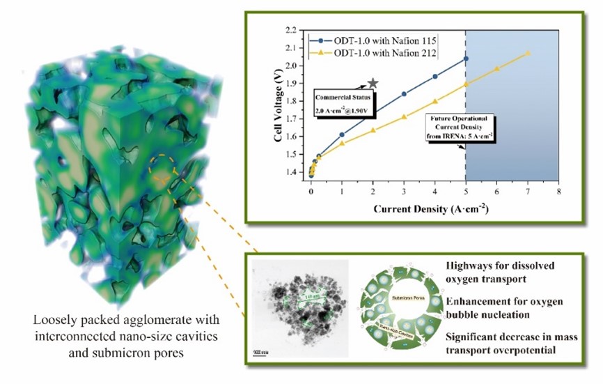作为一种具有动态特性好、产氢纯度高和稳定性强的电化学制氢技术,PEM电解水制氢技术被广泛应用。然而较高电解制氢电流密度下,由低效的氧气气泡传输造成的阳极催化层内的高传质损失,一直是制约PEM电解水制氢性能进一步提升的原因。针对上述问题,研究团队利用多尺度的表征技术和数学模型计算指出,离聚物紧密包裹IrOx催化剂形成的致密团聚体是造成阳极催化层内高传输损失的根本原因,进而针对性的进行团聚体调控,实现高效的阳极催化层内的氧气气泡管理。