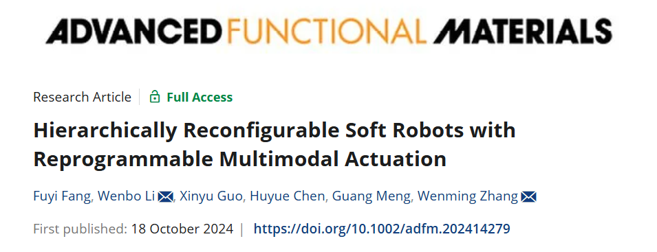 近日,80足球直播吧张文明教授团队在Advanced Functional Materials上发表了题为“Hierarchically Reconfigurable Soft Robots with Reprogrammable Multimodal Actuation”的研究论文,针对软体机器人首次提出了一种分级可重构的策略,并通过仿真、理论和实验揭示了弹性引导的多模式运动机理。该设计策略克服了以往模块化软体机器人运动模式不可改变的缺陷,将模块化的设计方法提升到了更高的维度。论文第一作者是博士生房付熠,通讯作者是张文明教授和同济大学航空航天与力学学院李汶柏研究员。
