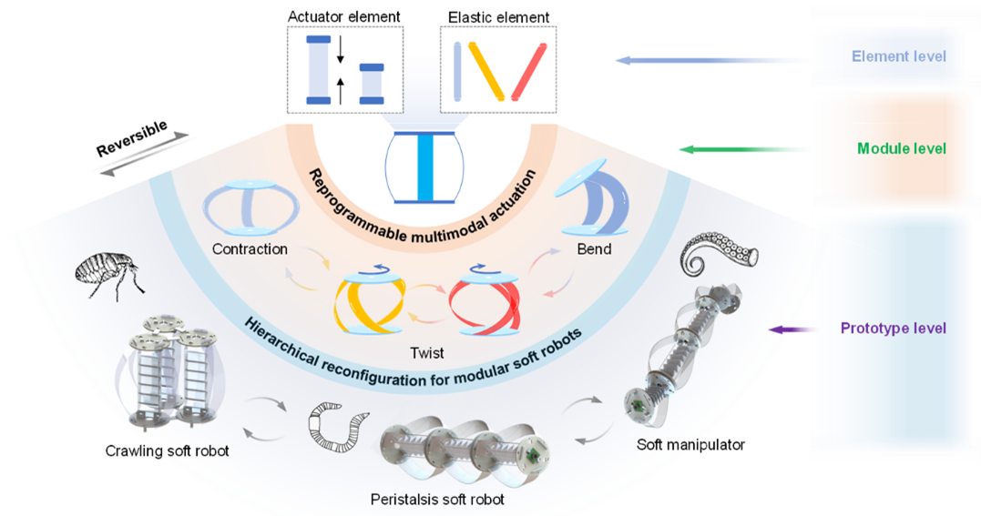 可重构软机器人在应对复杂环境和多变任务时表现出卓越的灵活性和适应性。然而,传统的可重构设计策略是基于特定结构和有限运动模式的软体模块,其可重构性或可扩展性受限。针对该问题,研究团队提出了一种分层可重构策略,不仅具备传统模块化机器人的功能,即通过模块间的组合构建不同的机器人,还能通过重编程模块内的弹性引导元件,实现模块的多种运动模式。