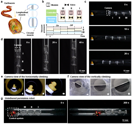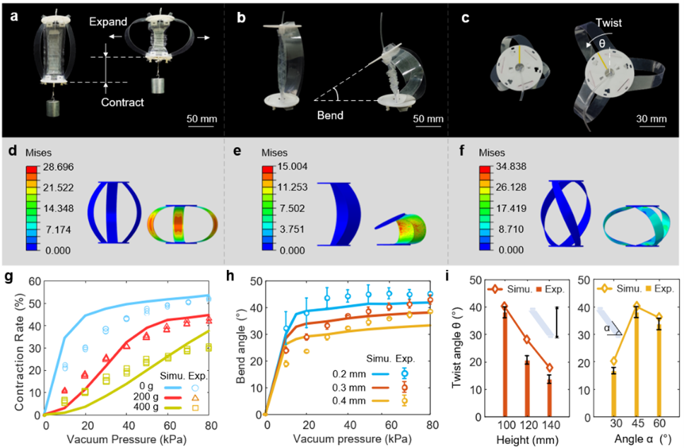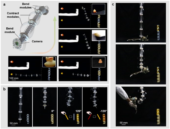 团队对收缩、弯曲、扭转三种基本的运动模式进行了仿真和实验研究,分别关注了负载以及弹性梁的尺寸参数对驱动性能的影响,并建立了设计参数与输出性能之间的联系,为软体模块的逆向设计提供了基础。利用这些模块,团队构建了仿蠕虫机器人、平面全向移动机器人、多模式机械臂等应用样例,其中,仿蠕虫机器人实现了无缆操作和摄像头搭载,为长距离管道探测提供了可能;多模式机械臂经过模块运动模式的重编程,实现了物体传递以及跨障碍探测等功能。