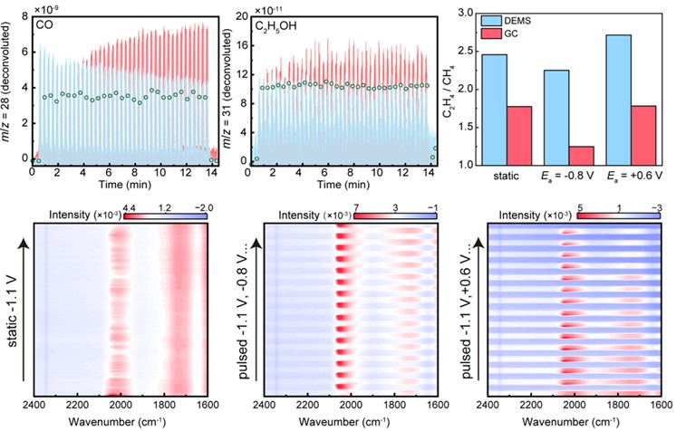电催化CO2还原反应的动力学和产物分布在很大程度上取决于阴极局部反应微环境,包括电极-电解液界面上的中间体演化,以及扩散层内的物质传输。脉冲CO2电解与固定电位下的静态电解相比,可同时调节阴极侧的电势极化和浓度极化,有效抑制析氢且提升目标产物的选择性,但其促进机制仍多有争议。对此,蒋昆团队发展了高时间分辨的在线电化学差分质谱DEMS、原位衰减全反射表面增强红外吸收光谱ATR-SEIRAS测量方法,并结合多物理场仿真,系统研究了Ag、SnO2和Cu电极上CO2脉冲电解的深层机制。
