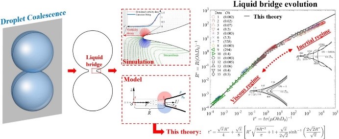 近日,80足球直播吧夏溪副教授与香港理工大学张鹏副教授合作,在《美国科学院院报》(Proceedings of National Academy of Sciences)上发表论文,揭示液滴融合过程中“液桥”不同增长规律的奥秘,提出了一个“液桥”增长的统一理论,有效兼容并整合了前人发现的粘性和惯性区间的规律。夏溪为论文第一作者。