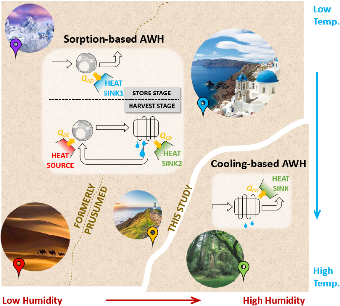 能源与水是21世纪的重要议题,发展高效节能的取水技术至关重要。在众多取水方法中,空气取水技术因其不依赖于水源、适应性广和轻便洁净等特性而引起了国内外学者的普遍关注。利用蒸汽压缩式系统进行冷凝取水的技术,已经达到商业化水准,但在一些缺水的内陆地区,冷凝取水所需的露点温度很低,使得构造相应冷源的能耗居高不下。同时受到水冰点的限制,冷凝取水在空气露点低于零度的地区难以适用。另一方面,吸附剂具有丰富的纳米级孔道结构,可在高温下富集水蒸气,有效提高空气露点,解决冷凝取水技术的困境,适应干燥地区取水的需求。近年来,已有研究针对吸附取水技术进行了大量的材料创新和可行性验证,然而,两种取水技术的能耗水平及其各自的适用边界并没有被明确划分,从而导致不同研究的测试工况和能耗评价方法难以统一。