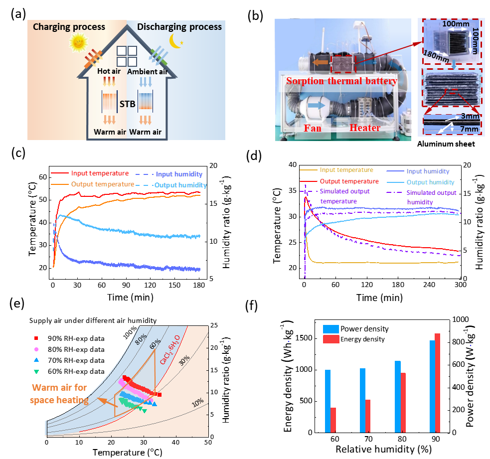 研究工作提出了从空气中取能实现超高能量密度储热的吸附热池,采用“水热合成-溶液浸渍法”制备了石墨烯气凝胶复合吸附材料,利用石墨烯气凝胶的高孔隙率特性和三维多孔骨架结构提高了反应盐的吸附-解吸传质性能,实现了反应盐固-气化学吸附、固-液潮解和溶液吸收的多步耦合,具有盐负载量高(96 wt%)、吸附量大(2.89 g·g-1)、吸附速率快和稳定性好的优势。在此基础上采用模块化石墨烯气凝胶复合吸附剂,构建了从空气中取能的吸附热池,通过耦合储热过程的热能梯级利用与放热过程的热能提质利用,实现了吸附热池向外界的连续供热,储热能量密度高达1580 Wh·kg-1、功率密度达815 W·kg-1,该工作为低碳高效、高能量密度、高功率密度的热能收集、储存和利用提供了新思路。