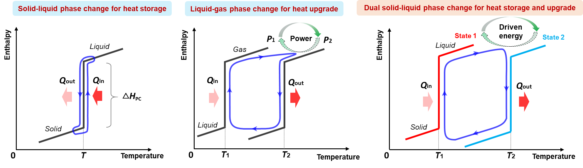 传统材料的固液相变温度近似恒定,适合用于热能存储;而气液相变行为则表现为多相变特性,可通过改变饱和蒸气压力改变相变温度,实际应用中表现为对热能品位的调控,即蒸气压缩式热泵或空调的热力学原理,然而气液相变由于体积变化大而一般不适合用于热能存储。如何打破传统材料相变特性的热力学限制,使其可同时用于热能存储与热能品位调控,则是一项极具挑战性的课题。通过深入调研分析,论文提出了利用特定材料的双固液相变特性和可切换相变行为,解决传统固液相变储热长期面临的瓶颈难题。类似于气液相变的多相变特性,特定材料在两种状态下具有不同的固液相变行为,通过某种能量驱动可实现两种状态的切换,该驱动能量可以是电能、电磁能、光能等。