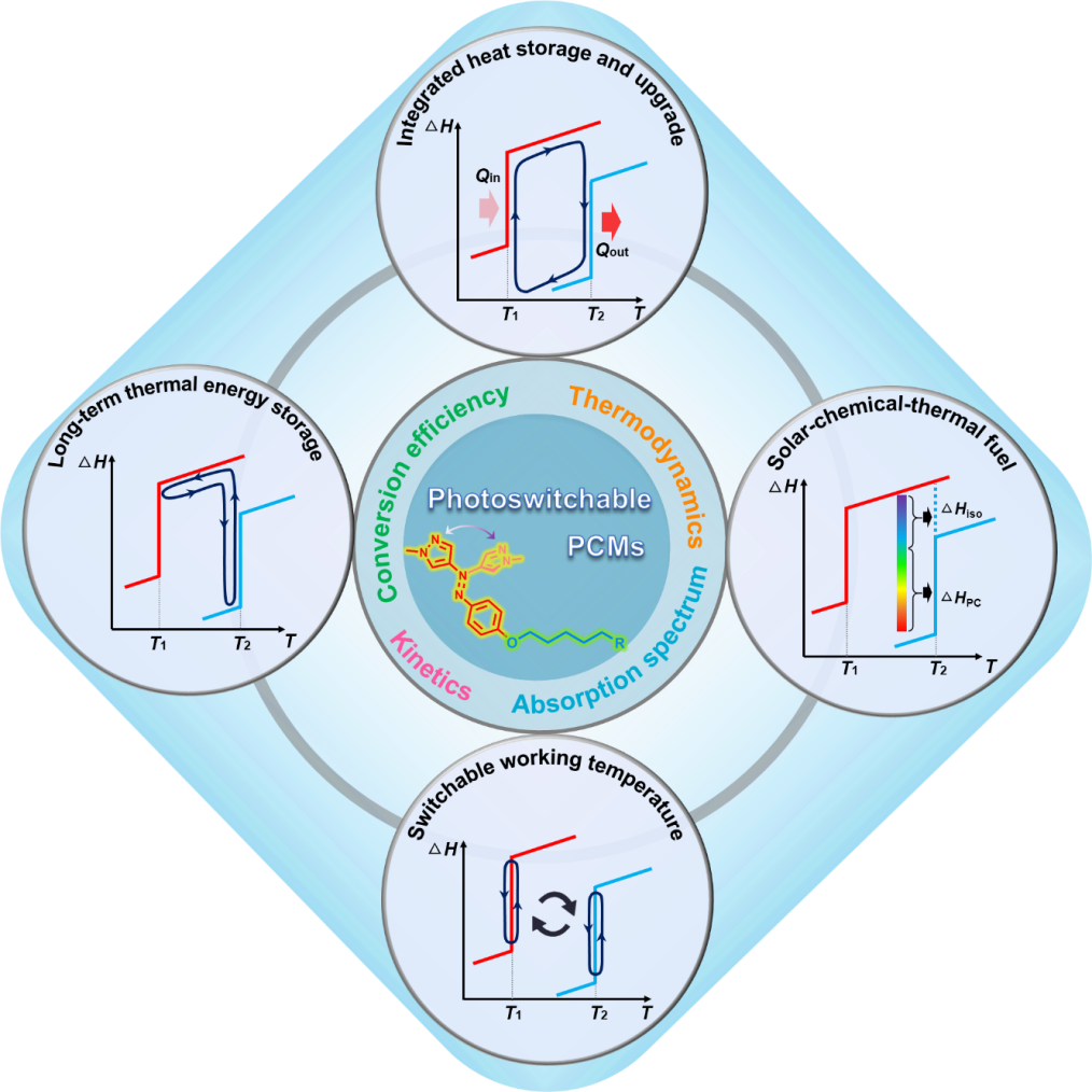 新兴的光化学相变储能将吸引来自化学、材料科学、能源科学等多学科的关注,需要从分子设计、材料制备、器件制造、热力学循环构建和系统优化等方面进行多尺度的理论和实验研究。需要进一步解决四个关键问题:1)通过合理的分子设计,包括使用柔性分子链、破坏分子对称性等调控材料的热力学性能;2)通过分子设计和材料制备强化分子异构和相变的动力学性能,如采用微胶囊技术扩大比表面积,加速光热传输等;3)通过提高量子产率和抑制光热效应提高能量转换效率;4)通过分子设计和器件设计调制吸收光谱,实现太阳能的高效转化和存储。此外,新的热力循环和系统结构设计对最终的实际应用也至关重要。研究工作得到了中国博士后科学基金“博新计划”项目和国家自然科学基金项目的资助。