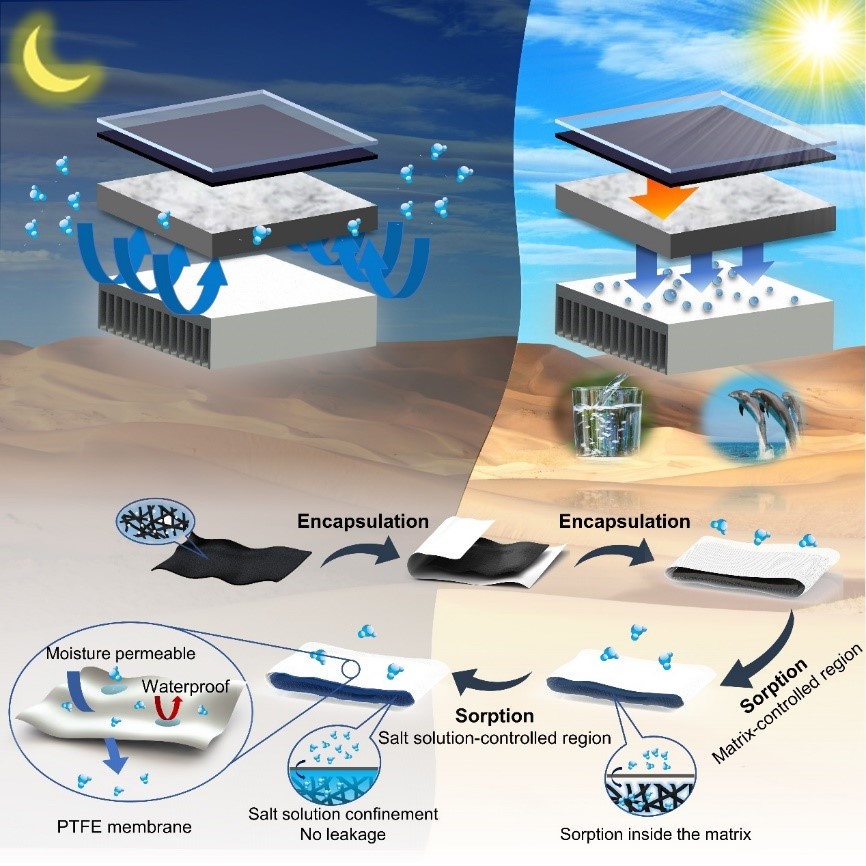 论文提出一种透湿、防水、多孔膜封装含盐复合吸附剂的方法,可完全解决盐复合吸附剂在长时间吸附过程或高环境湿度下盐溶液泄露的风险,将复合吸附剂的含盐量提高至80 wt %。该吸附剂可充分利用高浓度盐溶液的吸附能力,使复合材料适用于各种湿度下的吸附工况,水蒸气吸附性能最高达到3.75 g水/g吸附剂(潮湿工况90%RH)、2.83 g水/g吸附剂(半干旱工况70%RH)与1.47 g水/g吸附剂(干旱工况30% RH),超过绝大多数含盐吸附剂的吸附量。该方法制作过程简便、成本低廉、可拓展性强,适用于任何含盐复合吸附剂,防止可能出现的盐溶液泄露、腐蚀、水质下降问题,有望使用于未来中大型、连续型空气取水系统以及吸附发汗散热等领域。
