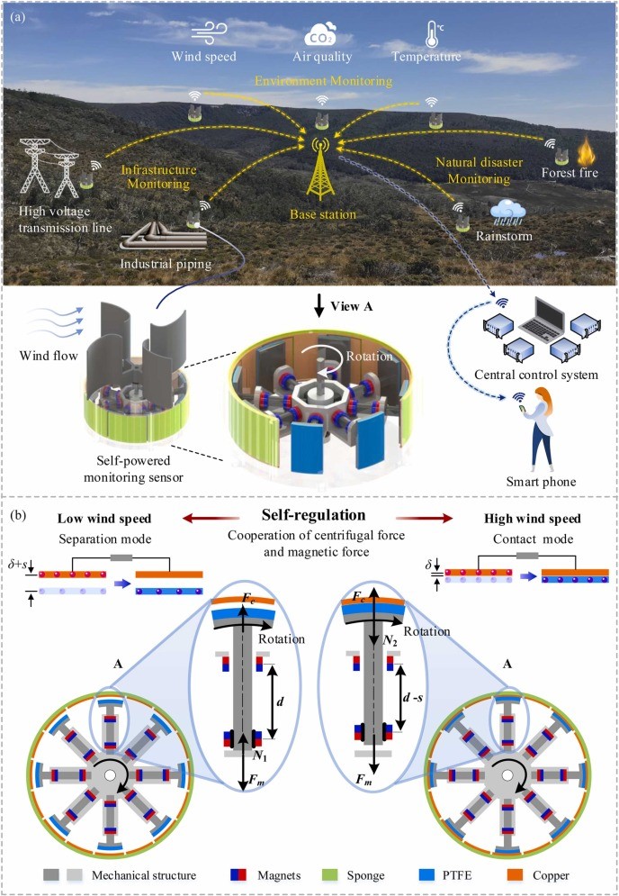 小型风能采集可与传感器集成,用于自供能生态监测、气候监测、自然灾害监测和野外基础设施监测等,对保护和改善人类的生活环境具有重要意义。然而,风的随机性和不规则性严重限制了风能收集和自供能传感技术的应用。