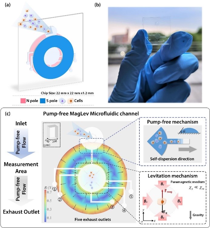 近日,上海交大80足球直播吧振动、冲击、噪声研究所张文明教授团队联合生物医学工程学院康亚妮副教授团队开展交叉学科研究,在生物传感领域期刊BIOSENSORS & BIOELECTRONICS上发表了题为Pump-Free Microfluidic Magnetic Levitation Approach For Density-based Cell Characterization的研究论文,提出了自驱动式非标记抗磁悬浮密度表征方法,设计了多通路式微流体芯片,建立了微尺度悬浮物检测力学模型,研究了微流体自驱动机制的加工工艺,实现了不同谱系及药物作用下细胞密度的有效表征。论文第一作者是博士后高秋华,张文明教授为共同通讯作者。
